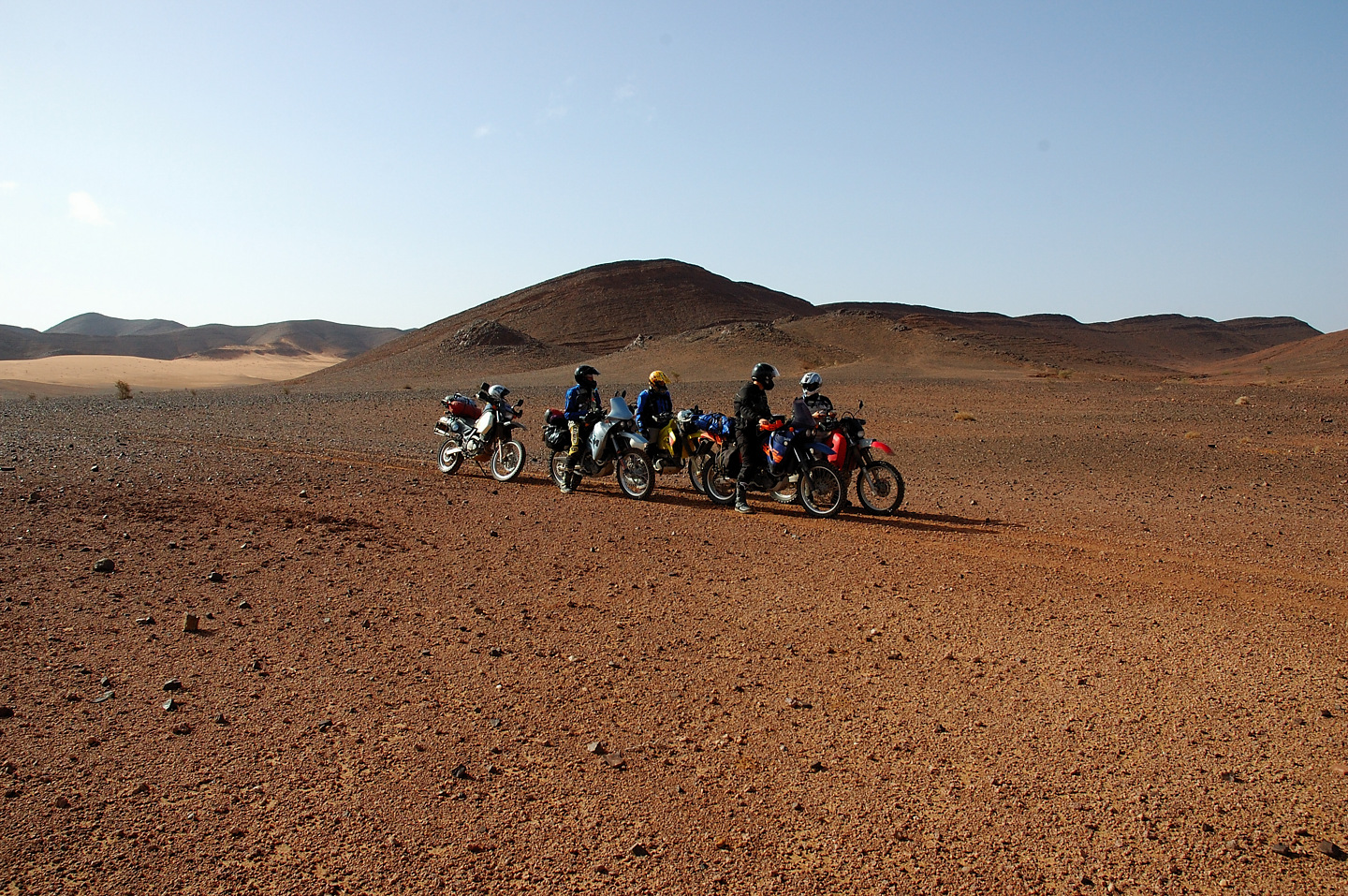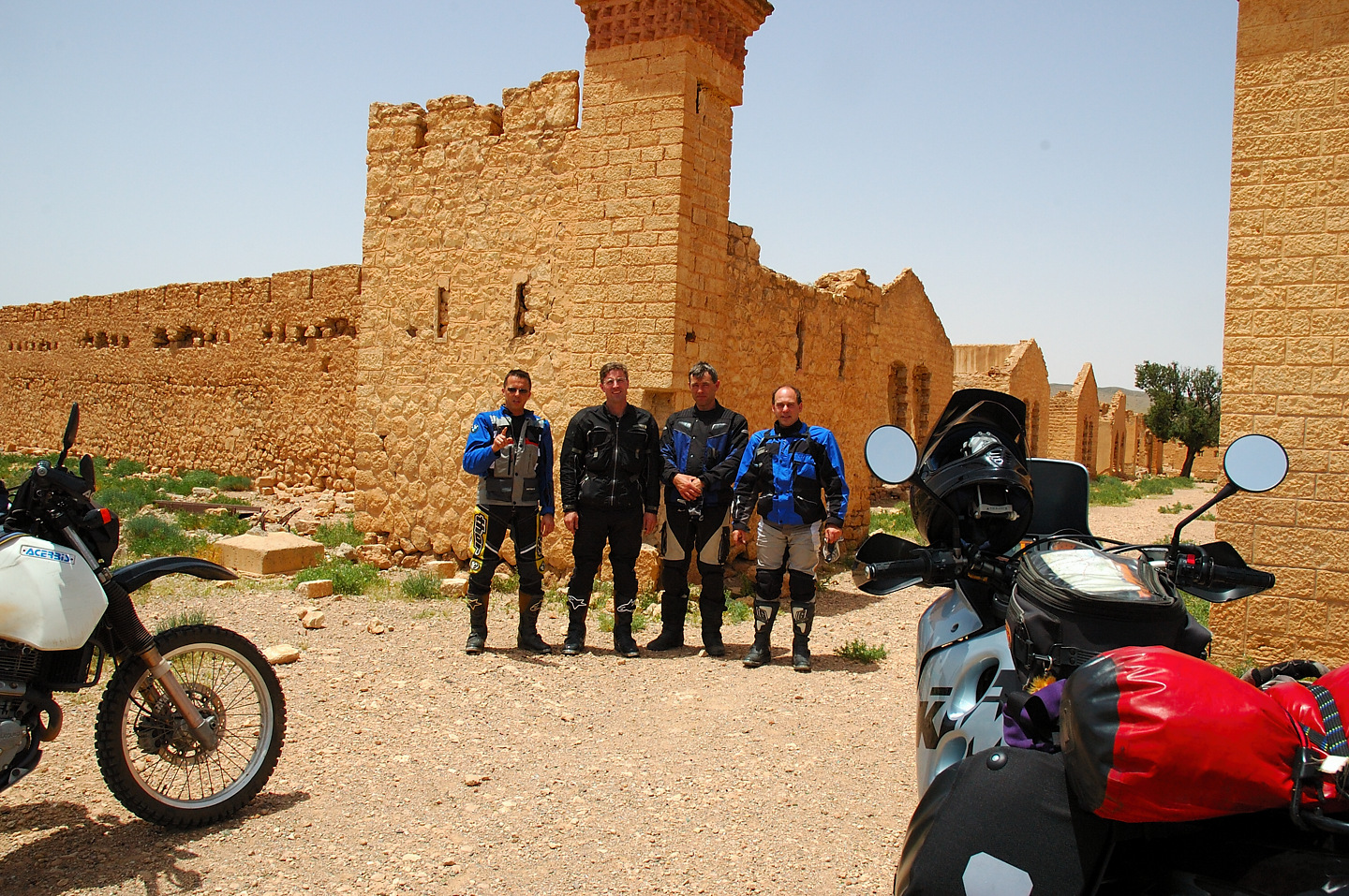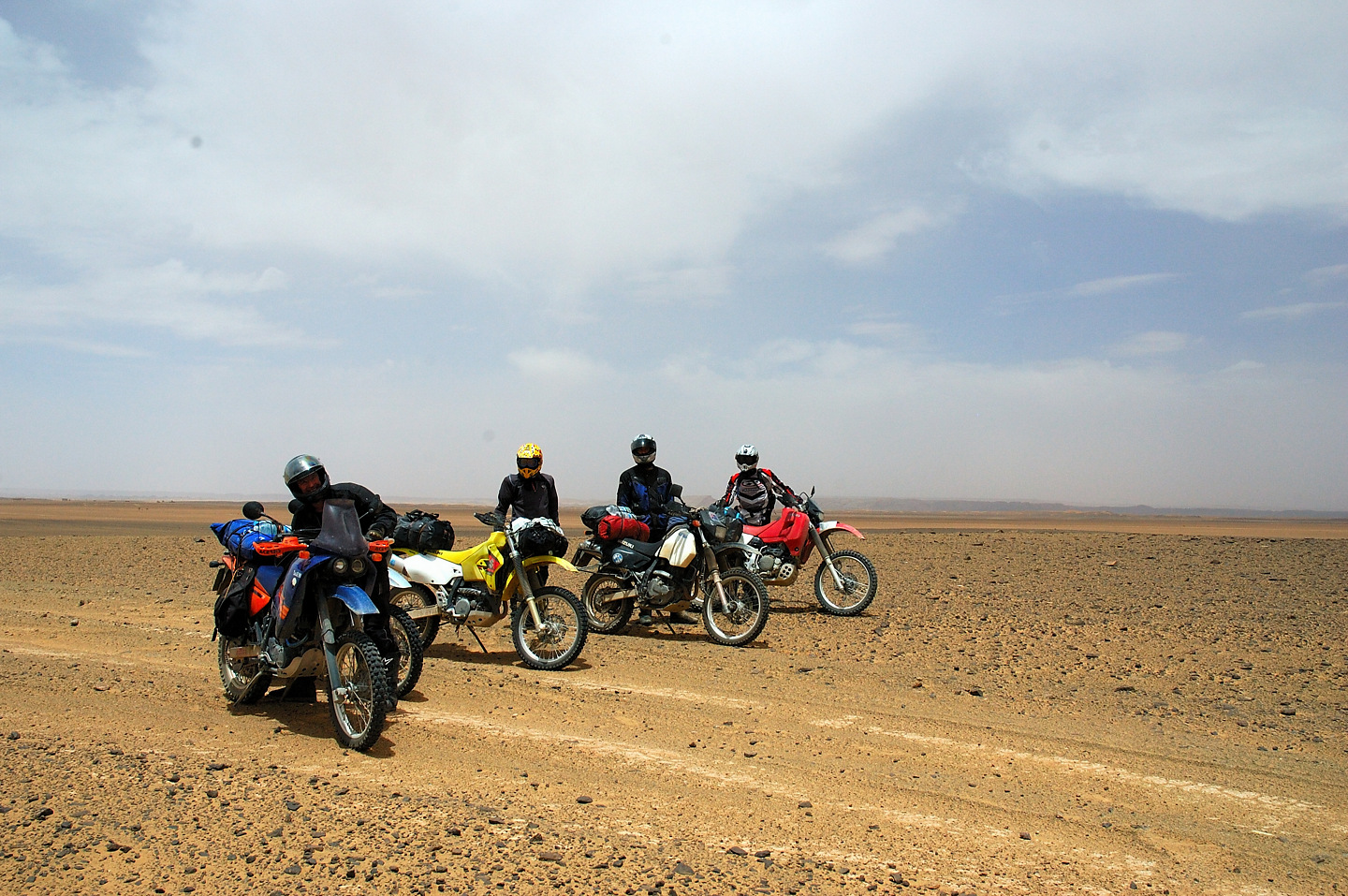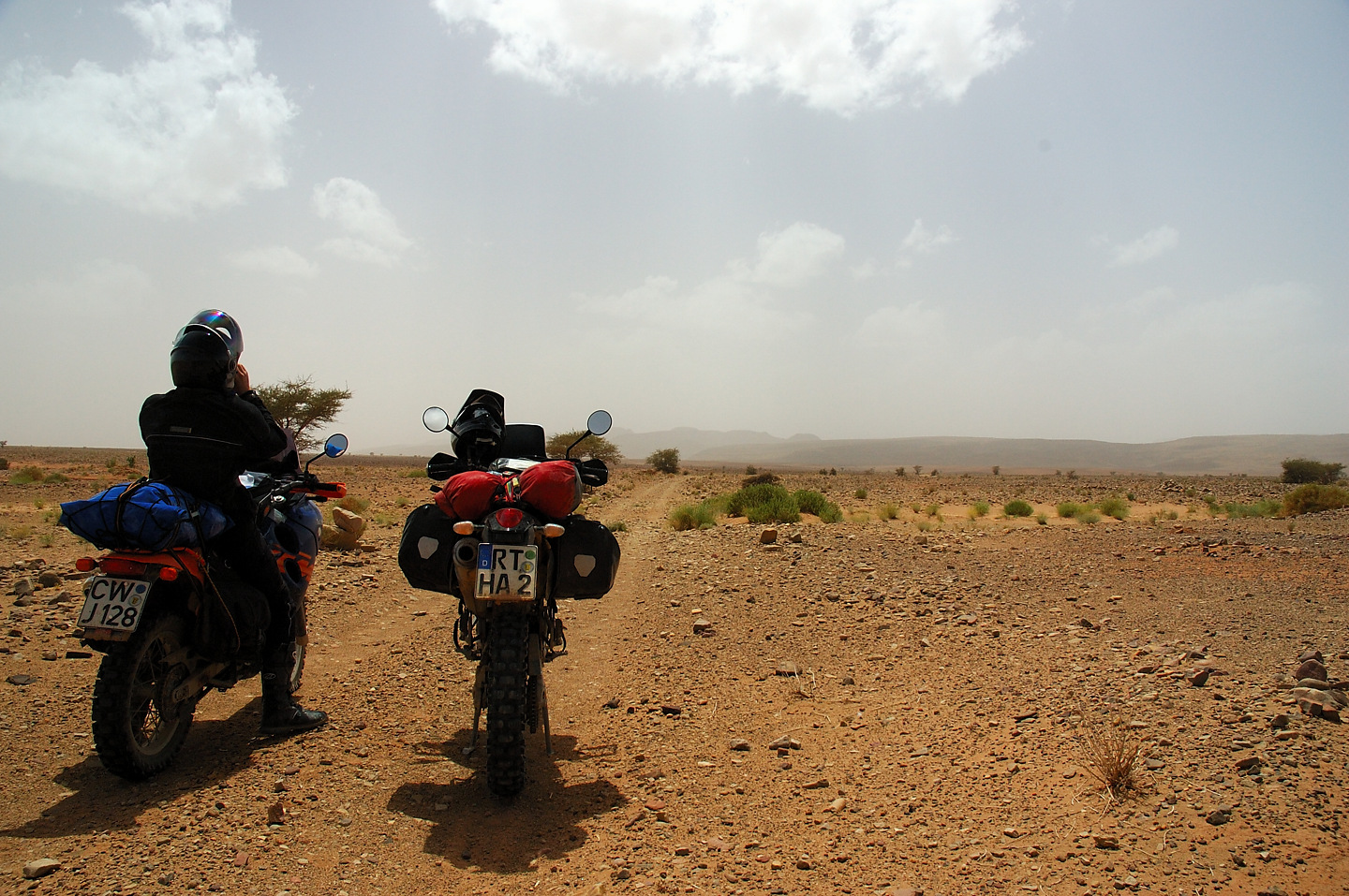 Gott sei Dank hat auch in diesem Jahr alles prima geklappt, das Material hat durchgehalten und keiner wurde verletzt. Leider konnten wir die Strecken im Süden nicht wie geplant fahren, die stärksten Regenfälle seit 16 Jahren machten uns einen Strich durch die Rechnung. Der ganze Süden Marokkos wurde durch die heftigen Unwetter in Mitleidenschaft gezogen. Hotels wurden in Merzouga weggespült, es gab mehrere Tote zu beklagen. Wir selbst hatten Glück im Unglück. Das Unwetter überraschte uns mitten in der Wüste, jedoch stand zufällig ein „Hotel“ am Wegesrand in dem wir für den restlichen Tag Schutz fanden. Entschädigt wurden wir durch ein tolles Schauspiel von Wasser in der Wüste und aufregende Strecken in Folge dessen.